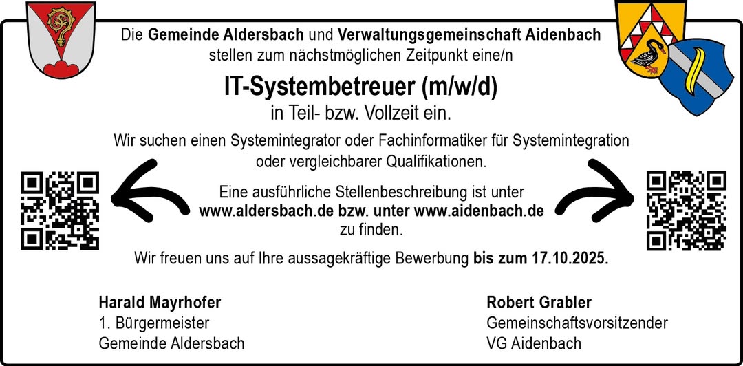 Wir suchen einen **IT-Systembetreuerin (m/w/d)** – bewirb dich jetzt und gestalte die Digitalisierung unserer Verwaltungen in 94501 Aidenbach und Aldersbach aktiv mit!