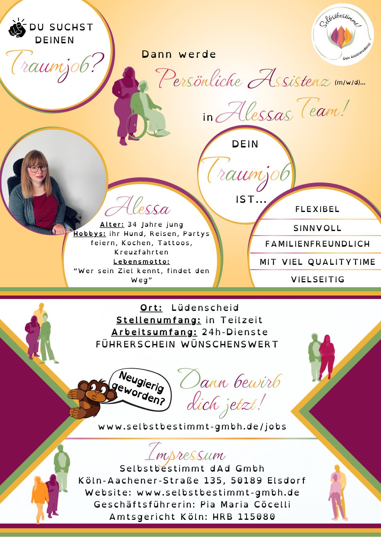 Alessa ist eine 34 Jahre junge Frau und sitzt aufgrund einer Muskelerkrankung im Rollstuhl. Um ein selbstbestimmtes Leben führen zu können, benötigt sie 24 Stunden am Tag Persönliche Assistenz. Zu Ihren Hobbys zählen unter anderem: ihr Hund, Reisen, Partys feiern, Kochen, Tattoos, Kreuzfahrten. Lebensmotto: Wer sein Ziel kennt, findet den Weg!