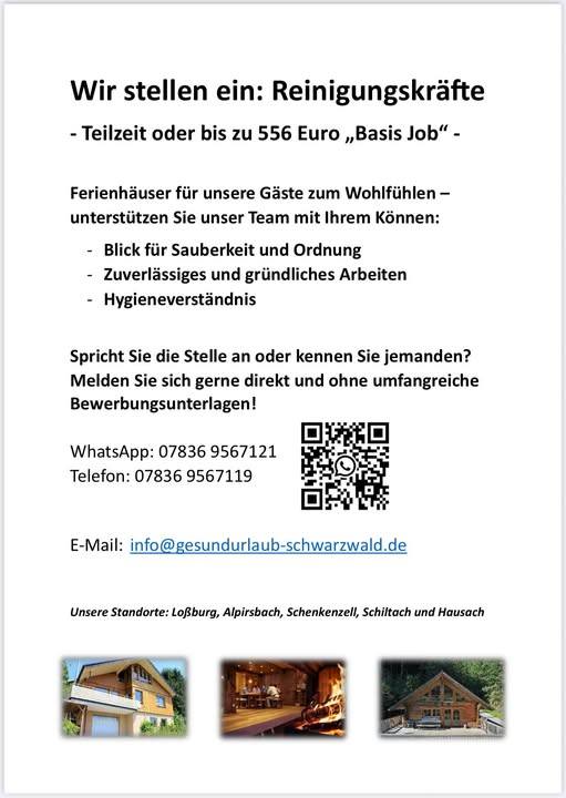 Wir vermieten mehrere Ferienhäuser und Wohnungen im Kinzigtal und wollen zur Verstärkung unseres Teams engagierte Menschen mit Erfahrung in der Reinigung einstellen.