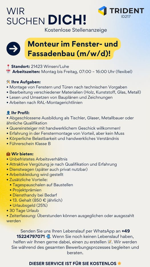 Kostenlose Stellenanzeige: Monteur im Fenster- und Fassadenbau - ID 217 Standort: 21423 Winsen/Luhe Arbeitszeiten: Montag bis ...