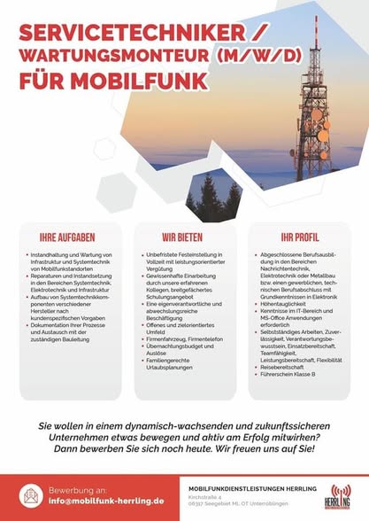 Zur Verstärkung unseres Teams bei Herrling Mobilfunkdienstleistungen suchen wir motivierte Mitarbeiter (m/w/d):