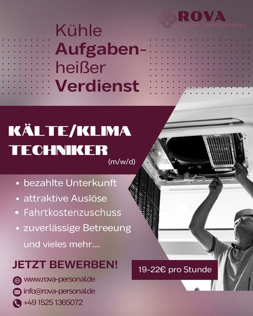 Interessiert? Bewirb dich gleich und sende eine Mail an info@rova-personal.de oder ruf uns an unter +49 1525 1365072!
