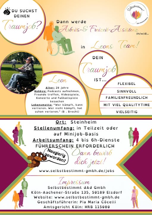 Bitte sende uns Deine Bewerbung über das Bewerbungsformular auf unserer Webseite: selbstbestimmt-gmbh. De / jobs /